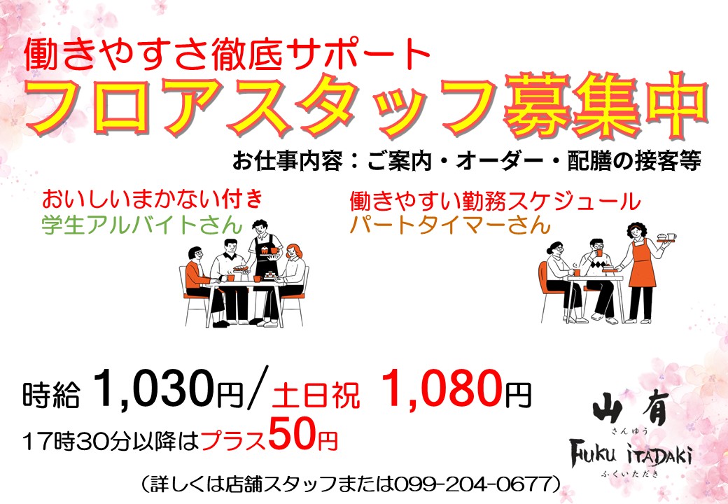 2026年1月30日 フロアスタッフ 募集中です 春から楽しく働いてみませんか?パートタイマーさん・・・働きやすいスケジュール調整が可能です学生アルバイトさん・・・おいしい「まかない付き」です 長期希望